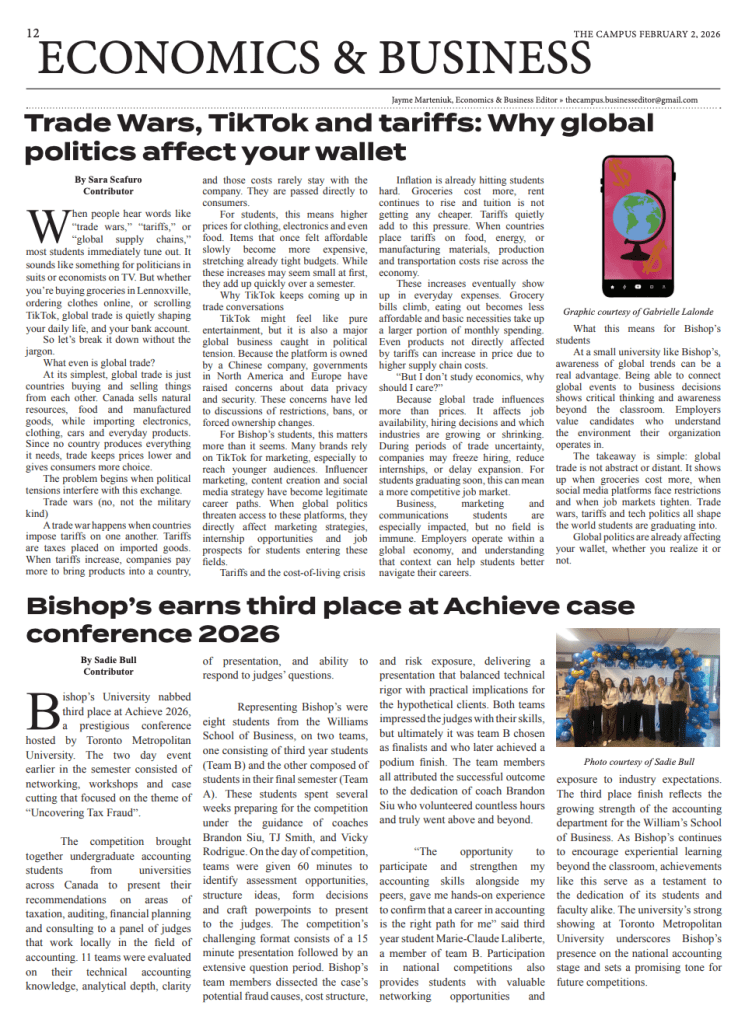 Sadie Bull – Contributor Bishop’s University nabbed third place at Achieve 2026, a prestigious conference hosted by Toronto Metropolitan University. The two day event earlier in the semester consisted of…