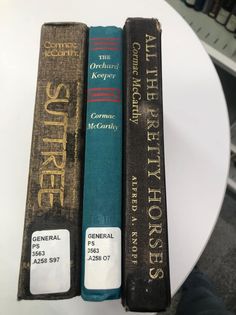Here in the basement of the Library Learning Commons I spread out the half dozen or so books. The Orchard Keeper and Suttree looked especially old and worn. Turns out they are both the first editions of the hardcover publications.