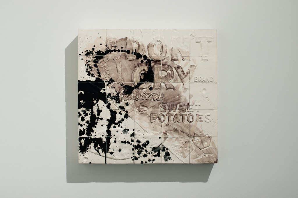 In the back room of the gallery, some visitors were debating over three clay wall reliefs named Spoils (2018), created by Patrice Renee Washington. From afar, they looked quite plain, but when I scrutinized the details, I could read “don’t cry brand Louisiana sweet potatoes.”