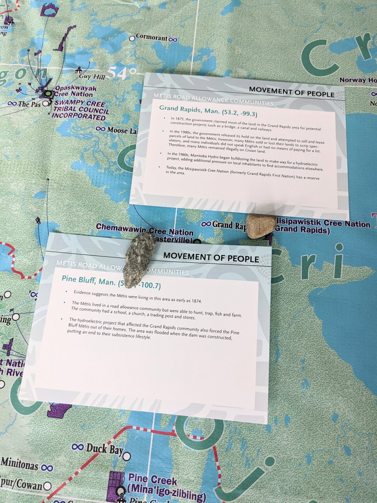Several more students met at the map on Thursday for an activity about movements of people. Vicky Boldo emphasized that many Indigenous people relocate because of a lack of sufficient resources like healthcare or economic opportunities today. During the activity, students mapped forced relocations or even eliminations of Indigenous communities, such as the Sayisi Dene in northern Manitoba. The Sayisi Dene were relocated in 1956 because of the incorrect assumption that their hunting practices were to blame for a drop in caribou numbers.