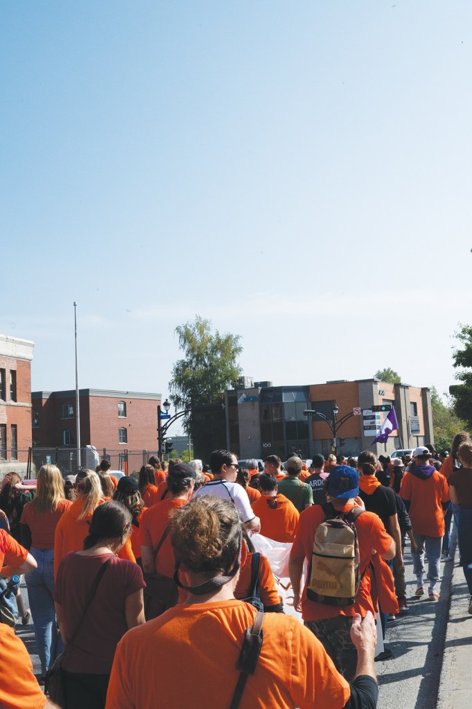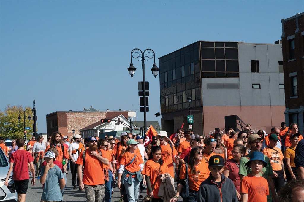 Attendees walked as an orange wave through the streets of downtown Sherbrooke to the Marché de la Gare, encouraged to use the time to silently honor those lost and impacted by the residential school system.