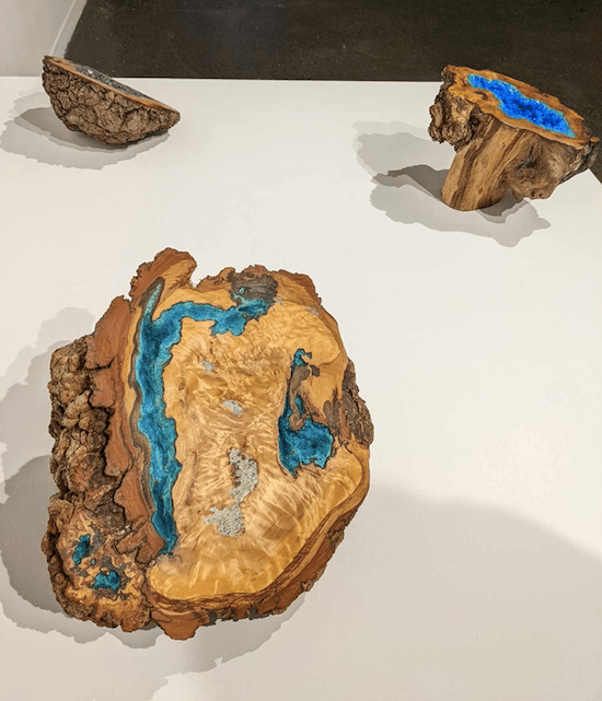 Each artist’s installations provide insights into these connections between geology and the living world. Illustrator and filmmaker Boris Labbé uses 3D models and satellite imaging to envision what the formation of a mountain range would look like. Cécile Beau, a visual artist currently located in Paris, presents an installation which demonstrates the real-time alteration of stones when continuously exposed to various liquids through the use of a drip irrigation system. Inspired by scientific research, sculptor Patrick Coutu uses imprints of rock walls from across Quebec to capture the “mineral history” of a site. Interdisciplinary artist François Quévillon uses videography to depict “a botanical and mineral encounter”, featuring a boulder and intertwined tree roots. Ontario artist Stefan Herda uses chemical manipulations to create artificial crystals which are held within plant-based supports like driftwood. Artist and lecturer Jen Southern’s animated video tells the narrative of a mound of seeded clay and the way it interacts with its environment on a loop. Finally, interdisciplinary designer and sound artist Yesenia Thibault-Picazo explores the phenomenon of metal assimilation through living organisms using videography and specimens.