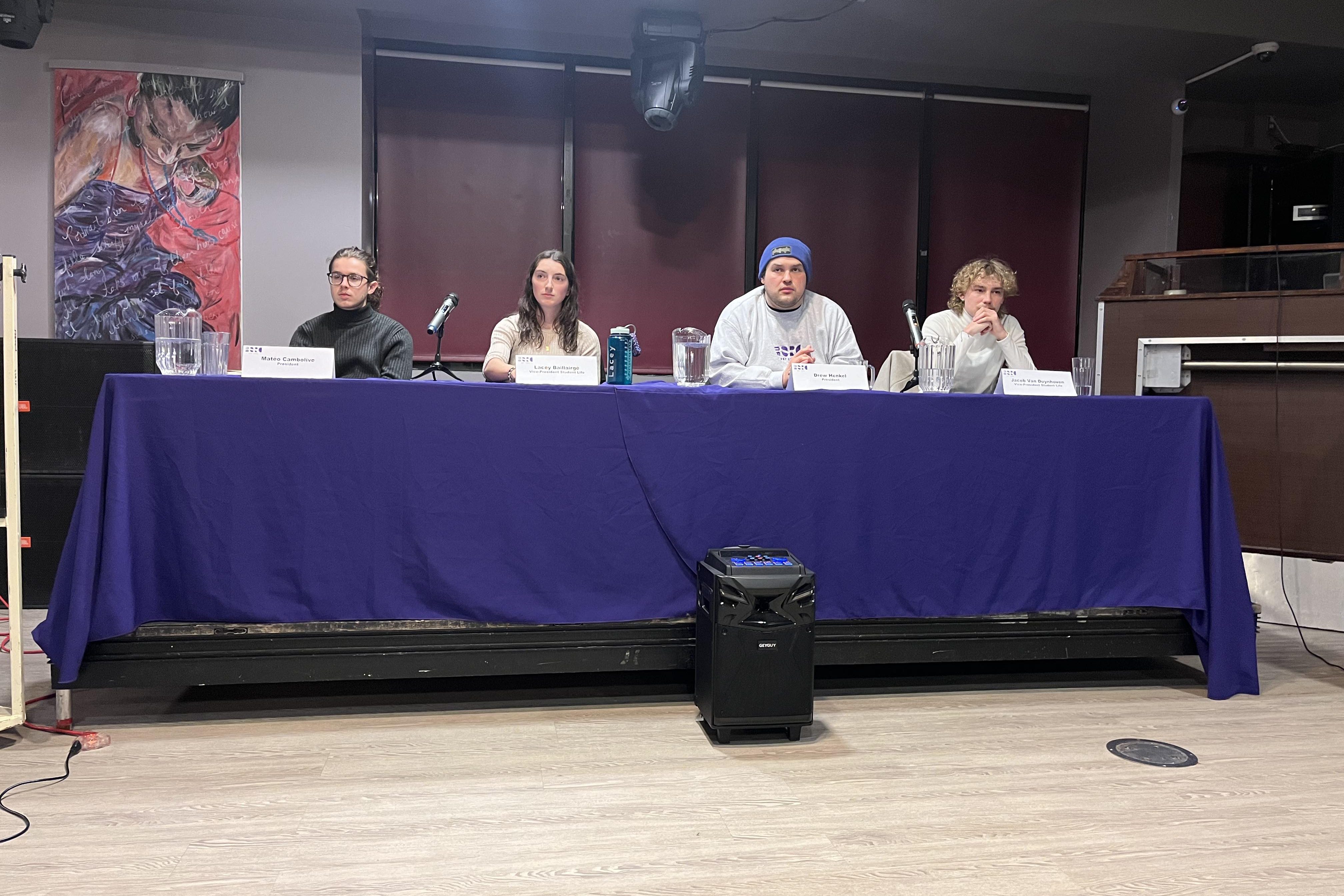 Lacey Baillairgé, VPSL candidate, is a business and pre-med student at Bishop’ simultaneously playing for the women’s rugby team and working as a resident assistant (RA) – a balance she says has trained her to manage her time and responsibilities. In her role, she would like to implement 24-hour study spaces and programs that foster “soft skills such as leadership and management”. She also discussed the potential of social “third space areas” separate from the workplace and home. Jacob Van Duynhoven, also seeking the VPSL position, is a business and sports studies student who describes himself as “very easy-going” and adaptable to any situation he is put in. He campaigns on increasing mental health outlets, continuing the newly implemented menstrual equity project established by the current VPSL Olivia Woods and improving the Gait nightlife. When Rosteius asked candidates about how they would address accessibility, Van Duynhoven proposed conducting a comprehensive accessibility audit on campus.
