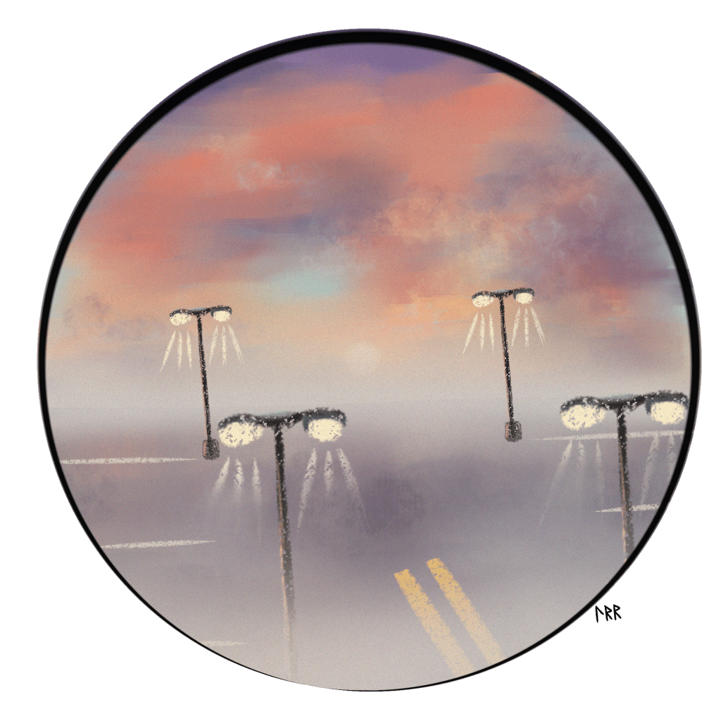 The evening sky was a wadded pair of old jeans. The dark-navy fabric had inconsistencies, pale streaks between deep-blue wrinkles. Cloudy residue from His washing dotted the twilight vista only to return to splotchy pockets. The dusky mountains served as dust-stained cuffs. Slashes of thinness revealed lighter and lighter shades, giving me glimpses of exposed flesh.