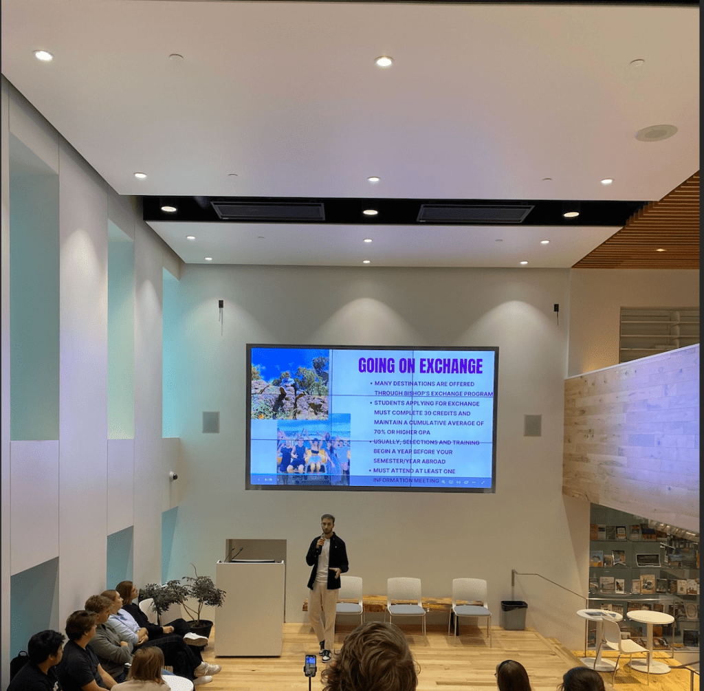 Valentin André, currently studying in the politics and international studies department, spoke about Bishop’s International and the many ways to study abroad while earning their Bishop’s degree. During his presentation he highlighted that, “all students have the opportunity to study abroad in a wide variety of destinations worldwide.” If students are interested in studying abroad, they should reach out to Bishop’s International via email or Instagram to learn more about their programs.