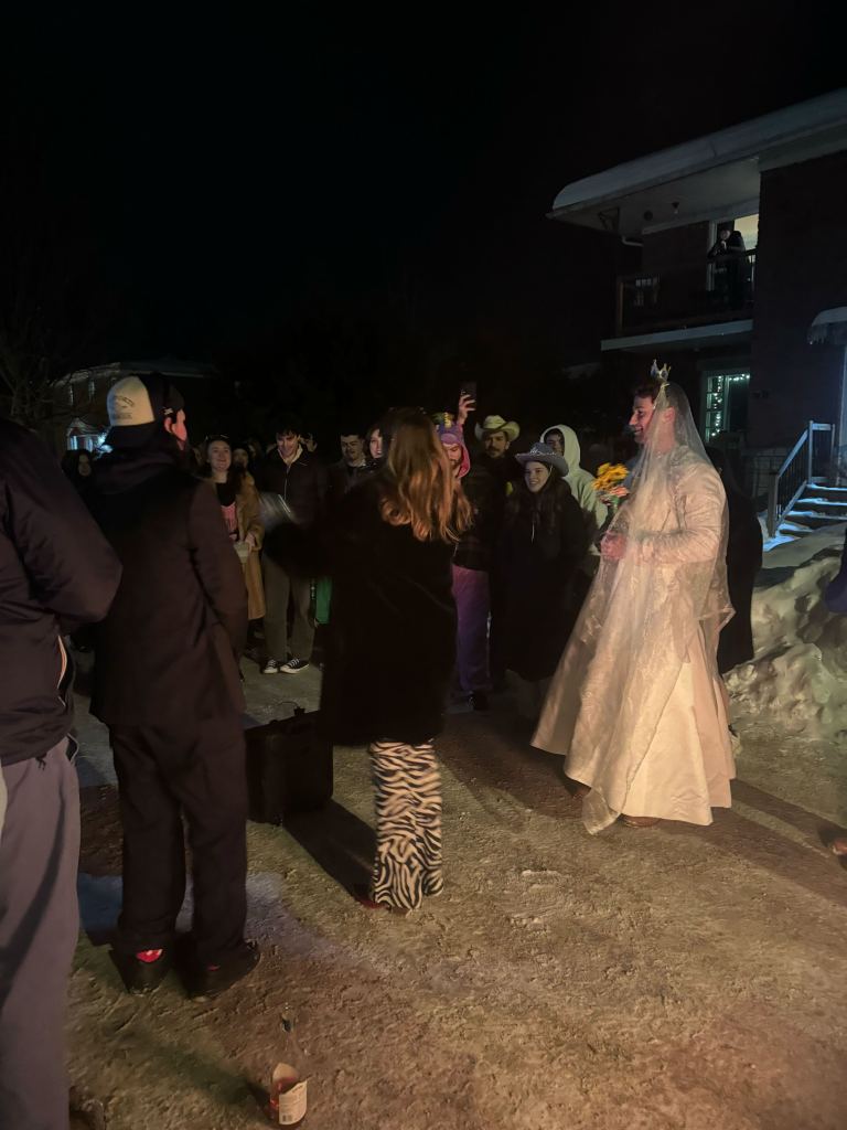 To quote Maggie’s wedding vows, “I texted everyone I knew and said, ‘Would anyone want to be my bride?’ and they all said no. But I ended up, as fate would have it, in the dungeon of the Lion, the most romantic – the SECOND most romantic location in Lennoxville, second to Reed Street. I was a girl with a dream, and the dream was to find a bride who would marry me as a groom… I was talking to some people, and they asked ‘Oh, who are you looking for?’ And I said, “Oh, any guy who would wear a dress…” and they went “Oh! Jonny will do it!”